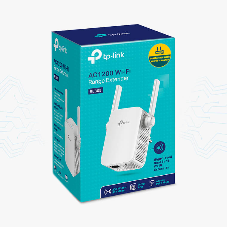 Versátil extensor de rango Wi‑Fi AC1200 dual‑band. Permite ampliar la cobertura de una red existente o, en modo AP, convertir una conexión Ethernet en una red Wi‑Fi dual‑band.