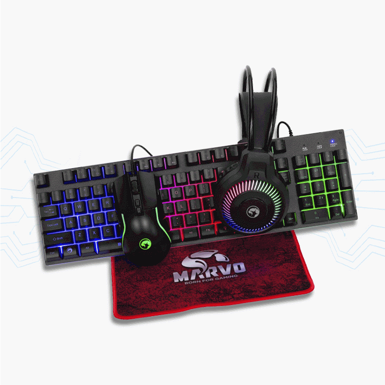 KIT 4 EN 1 MARVO CM-416 SP LOOT 40 104 TECLAS TECLADO/MOUSE/ AUDIFONO CASCO USB – 3.5mm/PAD MOUSE /MEMBRANA RGB USB 2.0