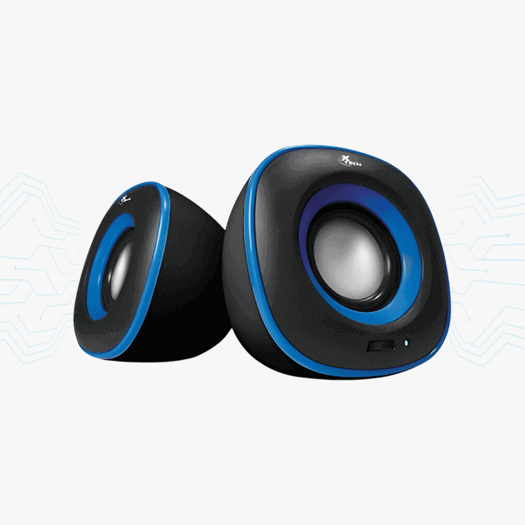 Controles Integrados: Perilla de volumen frontal para ajustes rápidos, configuración 2.0 canales estéreo de 2 vías, en parlantes multimedia con control de intensidad accesible.