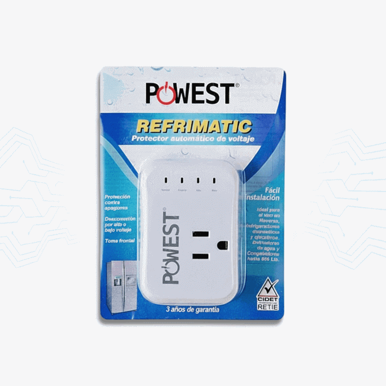 Ideal para proteger electrodomésticos de refrigeración contra variaciones eléctricas, este protector de voltaje Powest Refrimatic es un dispositivo especializado en desconexión automática por alto o bajo voltaje, perfecto para neveras, refrigeradores y congeladores en hogares o oficinas de Latinoamérica.